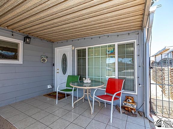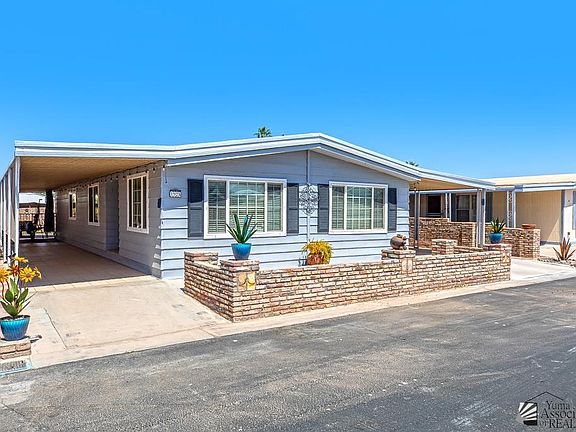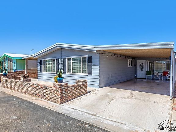 Beautifully maintained home with natural light and vaulted beam ceiling which creates an open airy feel. Wood laminate flooring in living, dining, and hall. Tile in kitchen and bathrooms. Kitchen with updated white cabinets with nice hinges and pull outs inside cabinets and wall pantry. Flat top stove and Bosh dishwasher. Dining area with a built in hutch. Full hall bathroom. Primary ensuite has a bathroom with garden tub and separate shower, and sliding doors to huge covered patio and oasis. Large shed will convey. Laundry pass to Arizona room with window AC and doors from carport and door to backyard. Casa Manana Estates is an upbeat lively 55+ community located in the heart of Yuma close to the hospital, medical, shopping, library,walking/bike path, and restaurants. HOA clubhouse, salt water pool & spa, shuffleboards, pool table, library, TV, potlucks, dances,luncheons, holiday celebrations, silent auction, BBQs, line dancing, poker, card games, water aerobics, and more fun!