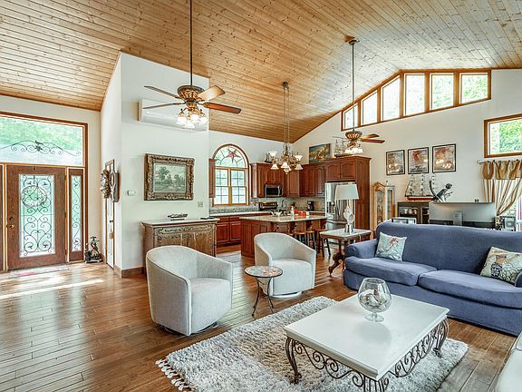 Very unique house with a ''true man cave'' built into the boulders. This house was featured in a local magazine for this rare feature. The great room has soaring vaulted ceilings with breathtaking views of the river and mountains. There is a large kitchen and pantry with plenty of room to entertain. The master is spacious with large windows on three sides showing 180 degrees of the river and mountains. The master bath was recently added on and has a soaker tub, double shower, large closet for her, two sinks and stunning view of the river. Tucked upstairs are two large size guest bedrooms with a jack and jill bathroom. The outside area has 3 decks with one covered with plenty of area to dine alfresco, have a fire pit or just watch the fireflies at night. This house is almost off grid and could be easily converted with the addition of solar. It has a well, septic and is wired for a generator. Schedule your showing today to take in the views firsthand!