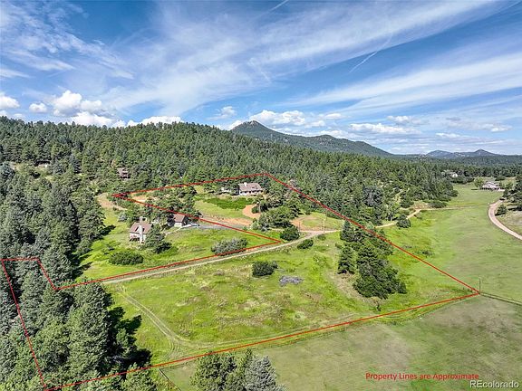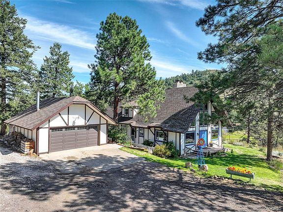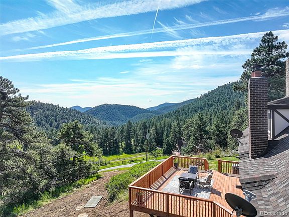 Enjoy beauty and tranquility in this quiet mountain neighborhood tucked in the Foothills with the wildflowers, conifer forest, and wildlife. Just a 20 minute drive from Morrison or Littleton and you'll escape to your charming Swiss chalet-style mountain home nestled atop 6.05 acres. Soaring vaulted ceilings and picturesque newer double paned windows bathe the home in natural light. The 2-sided floor to ceiling main floor fireplace or upstairs loft fireplace provides warmth throughout the house on those chilly fall and winter days. Sit in front of any of the 3 fireplaces or wood stove to enjoy a good book or glass of wine. Relax with your favorite beverage on your newly built deck overlooking a picturesque mountain valley and your pasture below. This freshly painted home with newly stained trim features 4 large bedrooms (with private decks off 3 bedrooms), 2 newly remodeled bathrooms, a large family room and dining room, and open kitchen to welcome your family.