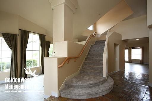 Absolutely stunning home with an open floor plan. Upon entering you will find a den area leading into your kitchen which features stainless steel and black appliances, built in double ovens, a large walk-in pantry and a breakfast bar plus recessed lighting. There is also formal dining room and bar area off the kitchen. The living room features an entertainment center and high vaulted ceilings. The enormous master bedroom is located downstairs, is fully carpeted, features a fireplace, has French doors leading to the backyard plus a large custom walk-in closet. The master bathroom is a must see with his and her separate sinks, a Vanity counter, a large shower and a separate Roma bath tub plus plenty of natural light. Upstairs you will find a large loft, two large bedrooms that share a Jack & Jill bathroom plus a third with its own bedroom and all bedrooms feature large closets. The backyard features a covered patio, a built-in BBQ area plus a large swimming pool and spa. All appliances are included, the home features a 3-car garage and pets are allowed with owner s approval. Call for a showing today!