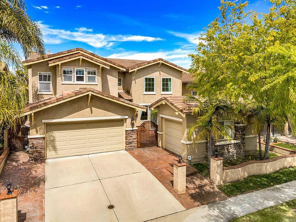 Visit this beautiful two-story residence situated in the Otay Ranch Community. Step through the gated courtyard to discover the cathedral ceilings in the entryway, a formal living room and dining room. The living room boasts a charming fireplace and seamlessly flows into the spacious kitchen featuring a central island. Enjoy serene views of the treelines from the backyard, offering a tranquil setting with no rear neighbors. Huge primary bedroom upstairs with beautiful views. Primary bath has has dual vanities, a soaking tub and separate walk-in shower. Secondary bathroom upstairs also boasts double sinks and private toilet area with shower tub. The house has open spaces and a wonderful layout: 4 bedrooms/2 full baths upstairs, 1 den/1 full bath and laundry room downstairs and 3 car garage, plus parking in driveway. Community amenities include a swimming pool, spa, BBQ area, parks, and walking paths. Security booth in both access streets. Convenient to excellent nearby schools, shopping plazas, and major freeways. 2 minutes west of the 125!