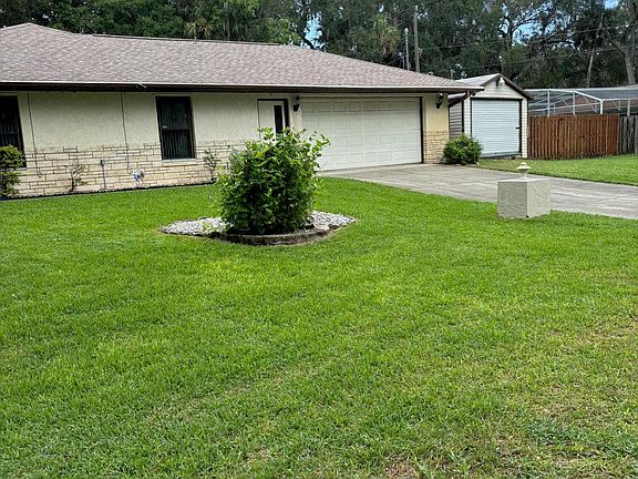 Located in the heart of Florida Shores in Edgewater. is this well maintained 3 bedroom, 2 bath home, sitting on a large corner lot with a screened in Pool, a work shop and plenty of room for an RV, with total privacy fencing and an oversize 2 car garage. Inside there are high volume ceilings, an open floor plan, with split bedrooms. The Great Room is spacious with large windows, giving the room lots of natural daylight. The Primary Bedroom is 15X15 with large walk-in closet; large bathroom with a walk-in shower, and there is a sliding door that takes you to the pool. The kitchen has lots of cabinets with lots of counter space. The AC was replaced in 2024 and the roof was replaced in 2022. There is a well and irrigation system.