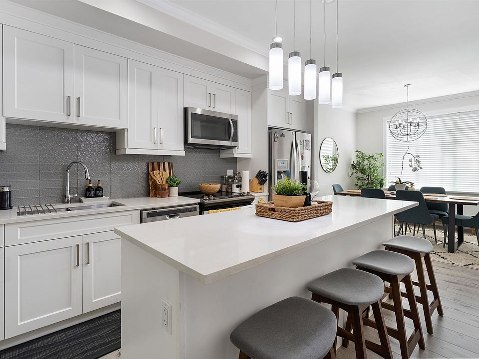 Welcome to "Greenfield Living", an immaculate, boutique-style residence in South Clayton. This 3 Bed/3 Bath home on the GREENBELT offers an open-concept plan with a BUILT-IN ENTERTAINMENT SYSTEM WITH FIREPLACE. The kitchen features S/S appliances, quartz countertops, and an oversized island. Laundry and three bedrooms up, master with walk-through closet with built-in organizers and luxurious 4-piece bath w/double vanity. Double garage with EPOXY flooring and NEMA 14-50 EV CHARGER. TWO LARGE PRIVATE PATIOS and backyard with ARTIFICIAL TURF. Minutes to Willowbrook Mall, shopping and transit. PROPOSED FUTURE SKYTRAIN coming within walking distance. Latimer Road Elementary & Clayton Heights Secondary catchment. Pets and rentals OK.
