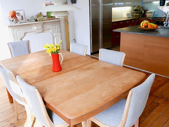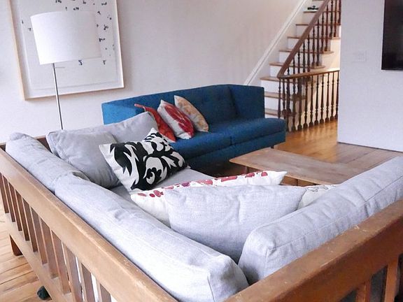 Beautifully renovated and sunny 3 BR brownstone upper duplex located in the North Slope for rent from now through Labor Day (and maybe through the fall). The main floor has a living-room, a half bath, and a large, open plan dining room/cook's kitchen with a quiet Bosch dishwasher & high end appliances. The top floor has two large skylights, a full bath with W/D, marble and glass tiles and an extra large bathtub/shower. The master BR has a King size organic 12-inch latex mattress and a view of the Manhattan skyline.. Two more bedrooms are set up for kids. The smaller room has a twin size organic futon; the other one has a twin bed with with a comfortable mattress and large closets. The whole apartment is very bright and sunny. The parlor entry has room for coats and shoes, and strollers. There are wood floors throughout and 4 decorative marble mantles. The apt is located on a beautiful tree-lined residential street, around the corner from the playground, half a block from a gourmet grocery store (Union Market) and the popular cafe the Milk Bar is just a few houses down our block. It's a 7-10 minute walk to Prospect park, and we're also near all restaurants and stores on 5th and 7th avenues. R,M,B,Q, 2 and 3 trains are all within a 5-6 minute walk. No pets and no smoking, please. 4900 dollars/ month + one month security deposit, refundable upon departure. Utilities are not included. The security deposit is due upon signing a sublease, the full rent is due before moving in.