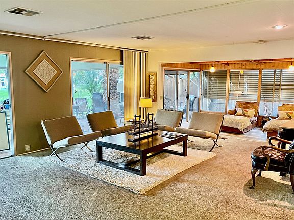 This lovely home is newly updated and located on the golf course with beautiful views of the course and water features. It's in the popular 55+ gated community of Date Palm Country Club. A 2 bed/2 bath double wide, it also has a hand crafted enclosed extra room with space for additional seating, dining, office or exercise space. The kitchen & dining room have been updated, including new flooring. Sit out on the long, covered patio enjoying the views while having a morning cup of coffee or an afternoon refreshment. Date Palm Country Club has the restaurant T on the Greens, an executive 9-hole golf course, tennis courts, swimming pools (including the one right across the street from the property), dog park, and many more amenities. Date Palm Country club is centrally located with easy access from Cat City to Palm Springs and Rancho Mirage, with bountiful restaurants, entertainment and shopping. Private showings only so call now to make your appointment!