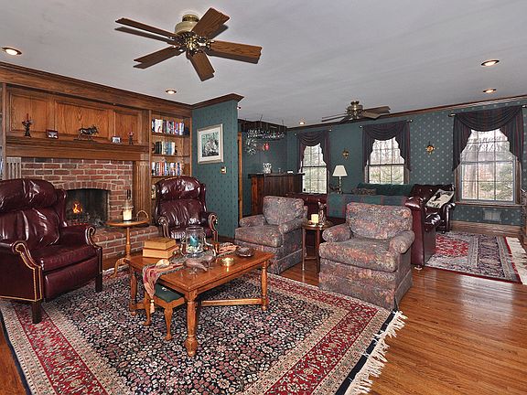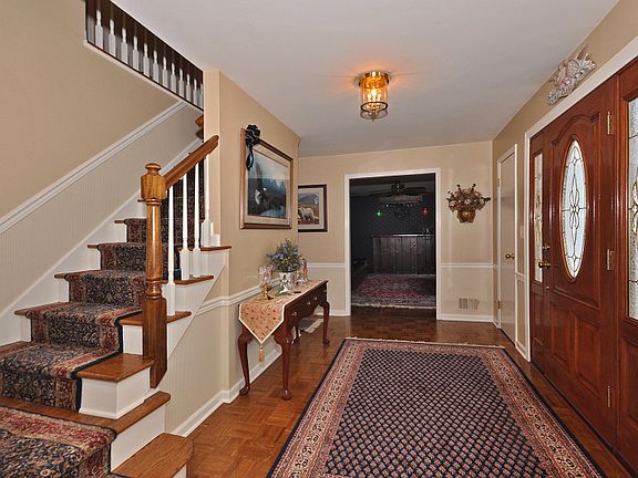 Elegant Colonal w/impressive wood door w/leaded glass sidelights into Foyer. Great Room w/gleaming HW floor, wood trim, brick FP flanked by floor-to-ceiling bookcases, sliders to deck. Formal DR.Gourmet Kitchen w/SS appliances, granite counters, parquet floor & a brght, cheerful breakfast nook. First Floor Laundry & Pwder Room. MBR w/wall-to-wall carpeting, WIC & Full Bath. 3 Additional BRs with abundant closet space. 2 feature HW floors & 1 has w/w carpet. Hall Bath w/granite topped oversized vanity & c/t floor. Exterior is for ideal entertaining & relaxation w/a 40' x 12' Deck and terraced Backyard w/bluestone paths leading to deck & peaceful wooded backdrop. 1st Floor window treatments included. Security System. Extra storage over the garage.