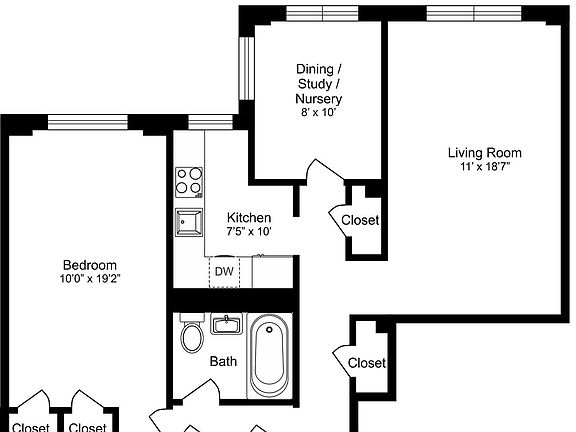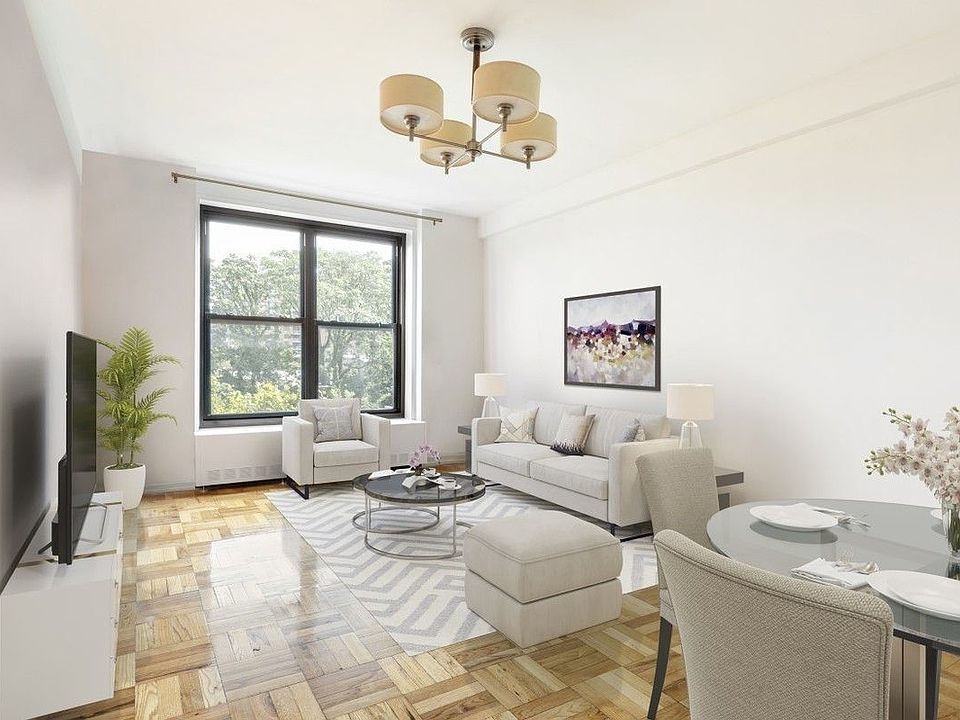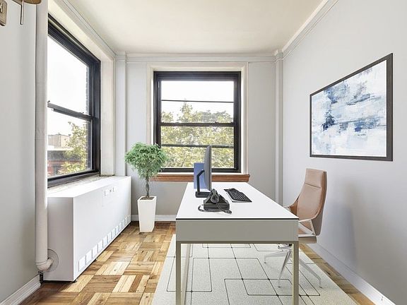 This generously sized Jr. 4 one bedroom has a converted home office/den/nursery with incredible views of Manhattan. The windowed kitchen has been updated and has a dishwasher. The apartment primarily faces east, looking Clinton HIll Brownstones but also has a northern window towards the Manhattan Skyline. The apartment comes with new windows which combine efficiency, sound dampening and easy cleaning. There is also a new smart heating system. The apartment was just freshly turned over with new paint and stone window sills. The in-demand Clinton Hill Co-op is very pet friendly and comes with a 24-hour staffed security entrance, laundry facilities, a bike room, manicured gardens and two elevators in each building. Clinton Hill is a perfect Brooklyn mix of exciting restaurants and bars with the beauty and calm of historic brownstone and tree lined blocks. You are near Fort Greene Park, the C and G trains, good buses and the retail and dining of Myrtle, Dekalb and Fulton.