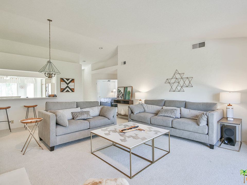 The BEST VIEWS in all of Desert Falls CC! Unobstructed mountain views from just about every window! It simply doesn't get any better than this! Perfect seasonal rental for golfers/snowbirds. Famous championship resort golf course with semi-private access. Amenities include: triple fairways w/ clubhouse, driving range, community pool in close proximity, recently renovated state of the art fitness center, tennis courts, and one pickle ball court. Upper level 3 bedrooms, 2.5 baths with recently updated master shower, brand new A/C, gas fireplace in living room, and breakfast nook. Brand-new furnishings in this cozy gem. Enjoy sublime sunsets from the large west facing balcony overlooking multiple fairways with incredible unobstructed panoramic mountain views. Enjoy sunrise while sipping a cup of java from the large entry balcony. Desert Falls is the perfect place to experience all the desert has to offer and this one won't last! Available after March 31, 2018.