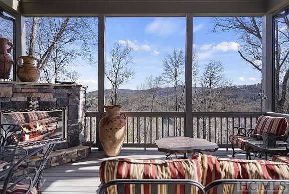A VERY SPECIAL 5 Bedroom 5.5 Bath home overlooking Lake Glenville and the mountains beyond from the estate section of Trillium Links & Lake Club. Situated on a 1+ acre landscaped lot, in a quiet very low-traffic neighborhood, the thoughtfully designed home offers lake and mountain views from all five bedrooms as well as decks on two levels. This home has nearly 3,700 sq ft of heated living space. All bedrooms are en suite with walk-in closets. The open floor plan main level includes a large stone fireplace, a large dining area, and a spacious kitchen, as well as an expansive covered, open porch complete with a fireplace and hot tub. While the master, with its generous master bath, is on the main floor, the upper floor contains two more bedrooms/bathrooms. The terrace level contains two additional bedrooms/bathrooms, a family room with a fireplace and a large kitchenette complete with a sit-down bar, wine cooler, ice maker dishwasher, etc. This area opens onto a screened porch with steps down to the stone fire pit and fenced-in area great for children and pets. All in all, the home offers a perfect retreat for a large family or multiple guests. This house has fiber optic, and benefits from numerous recent updates and improvements (see list). Offered PARTIALLY FURNISHED (see exceptions) but with NO CLUB MEMBERSHIP REQUIRED Fireplace Features: 2 or more