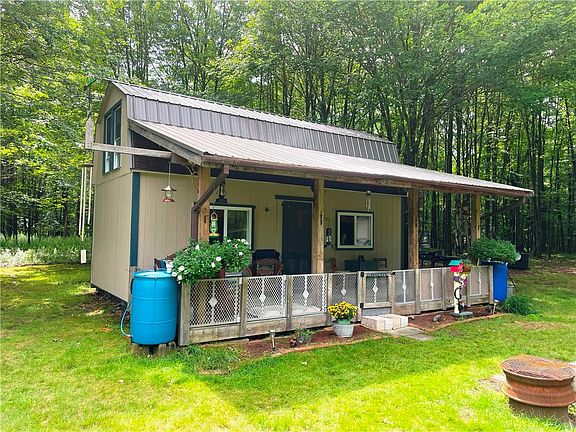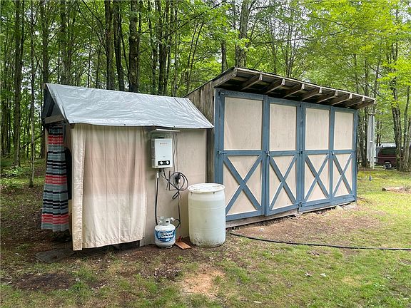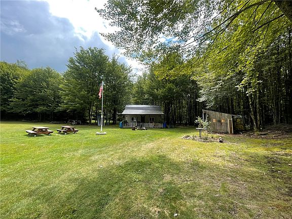 This fantastic recreational property BORDERS nearly 300 acres of State Forest Land. A gorgeous setting to build a permanent home or use as is for the perfect family get-a-way. Municipal electric and High Speed Internet at the end of the driveway. The cabin is currently set up with SOLAR power for on demand hot water, outlets and lighting. Outdoor hot water shower and outhouse on site. This cabin comes with all the comforts of home for seasonal living including a kitchenette, refrigerator, oven, propane heat and potable water using a rain water collection system. The current owners live here comfortably for 6 months a year! An upstairs loft features 2 bedroom areas. Large scenic yard surrounded by hardwood, pine, fruit bearing trees & shrubs drawing a variety of wildlife. Completely private and secure with a long driveway with cabled entrance. Included are two trailer boxes and a separate wood framed utility shed for your tools, equipment, ATVs and other toys. All of this bordering hundreds of acres of State Land for hiking, hunting, snowshoeing, X-Country skiing and more! Just 3 minutes to the Village of Sherburne for ALL your conveniences, shopping, restaurants, hardware & more!