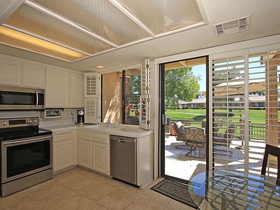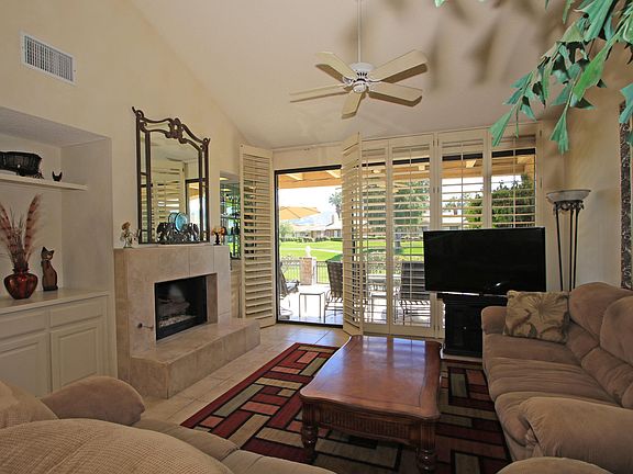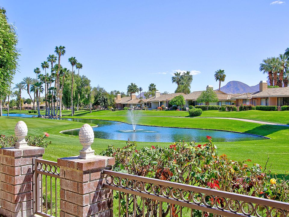 Fantastic opportunity and value in the Monterey CC. Spacious, SOUTH facing 2br2ba 200 Max Plan. Beautiful, peaceful location on the 4th hole of the South course with wonderful water, mountain and fairway views. Extended patio off the kitchen is perfect for entertaining family and friends. Vaulted ceiling, raised hearth gas fireplace, and wet bar in living room. Neutral paint, tile & carpet throughout, but also the perfect model to upgrade and personalize. Great seasonal and long-term rental possibilities too. Have it ready to go for next season! 27 holes of Ted Robinson designed golf, 15 tennis courts, 12 pickleball, bocce, and 37 pools & spas for your enjoyment. Centrally located in the heart of Palm Desert, Monterey CC is one of the most active clubs in the desert!