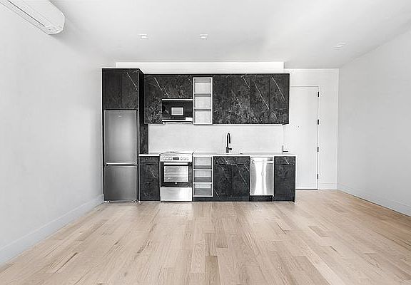 A brand-new building nestled on a quiet tree-lined street in the heart of Greenpoint, this modern 1-bedroom, 2-bathroom home blends sleek fixtures with organic textures while maximizing space and natural light. The apartment begins with a welcoming foyer with a coat closet. The open-concept living, dining and kitchen space has beautiful hardwood floors, gallery-style walls, and floor-to-ceiling windows. The kitchen is equipped with ample storage space, alluring white quartz countertops, sleek black marble texture cabinetry and high-end stainless-steel appliances. The bedroom has a built-in reach-in closet and easy access to a pristine full bathroom with a custom floating vanity, stone slab walls, and chic matte black fixtures including a rain showerhead. A private balcony off the bedroom is perfect for entertaining, sun lounging, urban gardening, and more. A pair of deep storage closets and a washer/dryer complete the home. 193 Greenpoint is a new, one-of-a-kind luxury building nestled within the heart of Greenpoint. Beyond the charming historical facade sits an intimate lobby adorned with accent lighting and warm color palette. Amenities include a 24-hour virtual doorman, landscaped common roof deck fully furnished with dining and lounge seating, washer & dryer in-unit and storage space for select units. Situated in the heart of Greenpoint, the building is surrounded by trendy restaurants, bars, cafes, and shops and is close to several parks and playgrounds. Public transportation options include the G subway line 1 block away at Greenpoint Avenue and the NYC Ferry. Alternatively, the BQE is convenient for drivers and the nearby waterfront will take residents to the India Street/Greenpoint Terminal Ferry stop.