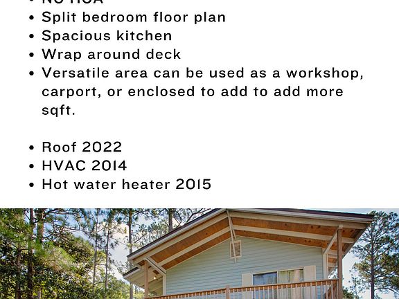 Welcome to this lovely stilted home in Santa Rosa. Through thoughtful design and strategic layout the home's 900 sqft lives much larger. The open kitchen concept has ample space for meal prep and enough cabinetry for all your storage needs. The master bedroom has a large glass door that leads to the large wrap around deck with peak-a-boo water views. Underneath the main living area, you'll discover a convenient carport and workshop space. This versatile area is wired and plumbed and can be enclosed into additional living space, providing endless possibilities to meet your unique needs.