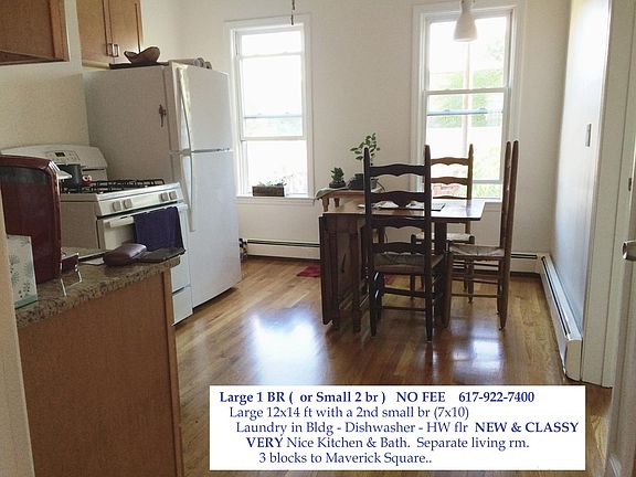 NO BROKER FEE! Jefferies Point apt. Video Tour here: Small 2 BR / Large 1 BR ( 3 people maximum ). 1.5 BR is 3 min to Maverick Sq. Recent Remodel. NICE, CLASSY apt for You. 1 Large Bedroom plus a small office/guest room fits a twin bed Laundry in Building. Large eat-in kitchen, Large Family Room, Closets every room & linen closet in bath. Dishwasher, Granite, HW floors, Ceramic Tile bath. see Pics and Video, this place is Beau-ti-ful Shared PATIO in back. Street Parking. Nice area, 3 blocks to subway, restaurants, SO convenient. Come See it or watch the Video. NO BROKER FEE Renter responsible for Gas, Electric. Owner pays for Water. 1 year lease.