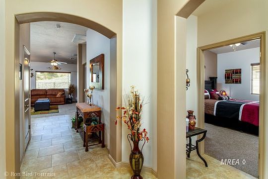 This home has been very nicely appointed from the front curb to the backyard fence! The homes' exterior has been finished with a colored & stamped concrete driveway as well as front & rear patios. The front patio walls are capped with tile and offer a protected seating area to enjoy the southern mountain views. Entering in through a full glass storm door, you'll notice right away how immaculate this home is. Wide hallways & large floor tiles in an offset pattern lead the way to the 2 guest bedrooms & shared bathroom. Bedrooms have large windows & ceiling fans & share a bathroom styled with a granite countertop vanity & tub/shower combo with tile surround. The kitchen is arranged with a lovely granite countertop island with raised bar top, large bay windows in the dining area to bring in the views, and a very comfortable living area. A large master suite offers views from the window and the bathroom is equipped again with granite counters, separated sinks, a large soaker tub and a tiled walk in shower with tinted glass. A fully fenced backyard offers a relaxing atmosphere where you can take in views of the Canyons Golf course and ponds as well as Flat Top Mesa!