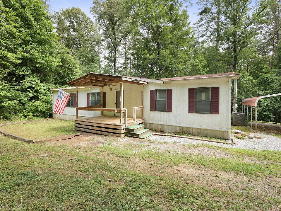 Unrestricted 1.37 acre, gently sloping property with Pole Bridge Creek frontage! Secluded homestead with 3 bed 2 bath home with updated flooring and wood paneled walls, covered carport, covered RV hookup, and storage shed. Perfect opportunity to enjoy mountain living under $200k. Enjoy the home or build anew.