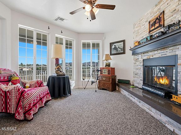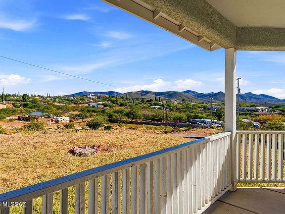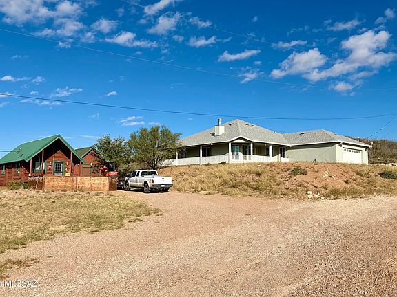 Perched high above historic Tombstone, this 1.5-acre hilltop hideout offers panoramic 360 views. Built in 2019, the 2,180 sq ft main home features 2 beds, 2 baths, granite counters, high ceilings, dual-pane windows, a cozy fireplace, and a surround-covered porch--perfect for quiet sunset reflections. The oversized garage is ready for hobbies or projects. An additional outbuilding is perfect for gear and storage. The 394 sq ft guest cabin or bunkhouse adds 1 bed and 1 bath, ideal for company, outlaws and cowpokes passing through the Old West. Total 2,574 sq ft. Take a short 5 minute amble on down to the boardwalks and visit towns folk, shops, stage line and saloons of the legendary world-famous and historic streets of Tombstone!