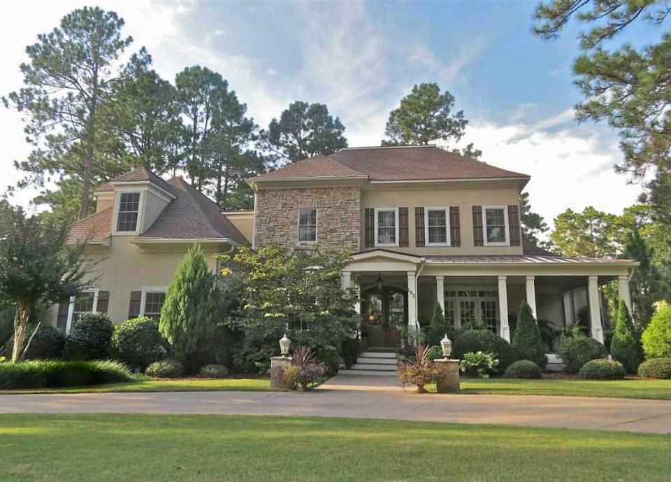 Privacy, livability, and style abound in this spacious home in Pinehurst #9 at National. Located on a fantastic golf front lot, beautiful views of the Jack Nicklaus-designed course await as you peer across not one, but two fairways. This element of seclusion is further fostered by the positioning of the home next door as neighbors are barely visible from the covered back porch. Packed with upgrades, the kitchen boasts granite countertops, a breakfast bar, double ovens, a separate gas cooktop, and soft-close cabinets and drawers. The built-in Sub-Zero refrigerator incorporates cabinet panels to provide the sleek, finished look found throughout this home. Beautiful landscaping and a convenient circular drive greet visitors, and the wide front porch and swing beckon, calling out for