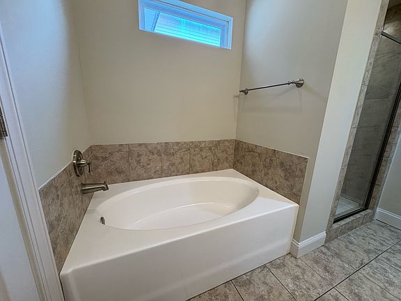 The spacious primary suite, located on the main level, offers a walk-in tiled shower and a separate soaking tub. Upstairs, you'll find two large bedrooms and a full bath with dual vanities.