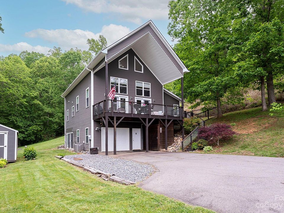 Peaceful and private, this low-maintenance, 1.5-story A-frame is the perfect contemporary mountain cottage, with fantastic views of the Blue Ridge from its fantastic covered front porch! Main living area features a wall of windows that floods the home with sunlight, plus a wood-burning stove for chilly evenings. The open-plan kitchen with stainless steel appliances is fit for a chef, and you're sure to enjoy the vaulted ceilings, luxury vinyl plank flooring, and more in the loft-style primary suite. There's also a finished lower level, perfect for a home gym, studio, office, or bonus room — and plenty of outdoor living in the fenced-in yard with storage shed, attached one-car garage, and flat, expansive driveway. Situated on a gorgeous and gentle 1.74 acres (two PINs: #9727452981 and #9727461015), only 5 miles from Mars Hill University, 20 minutes to Weaverville, and 30 minutes to vibrant downtown Asheville, this property would make an excellent primary residence or short-term rental!