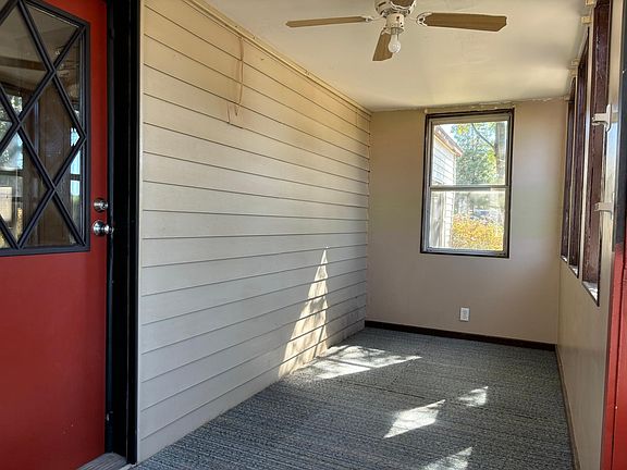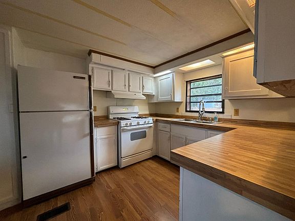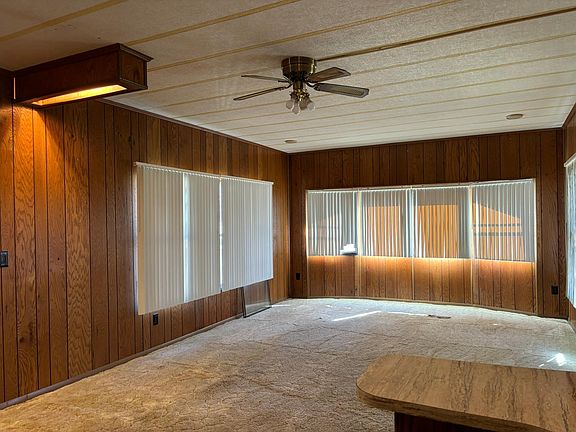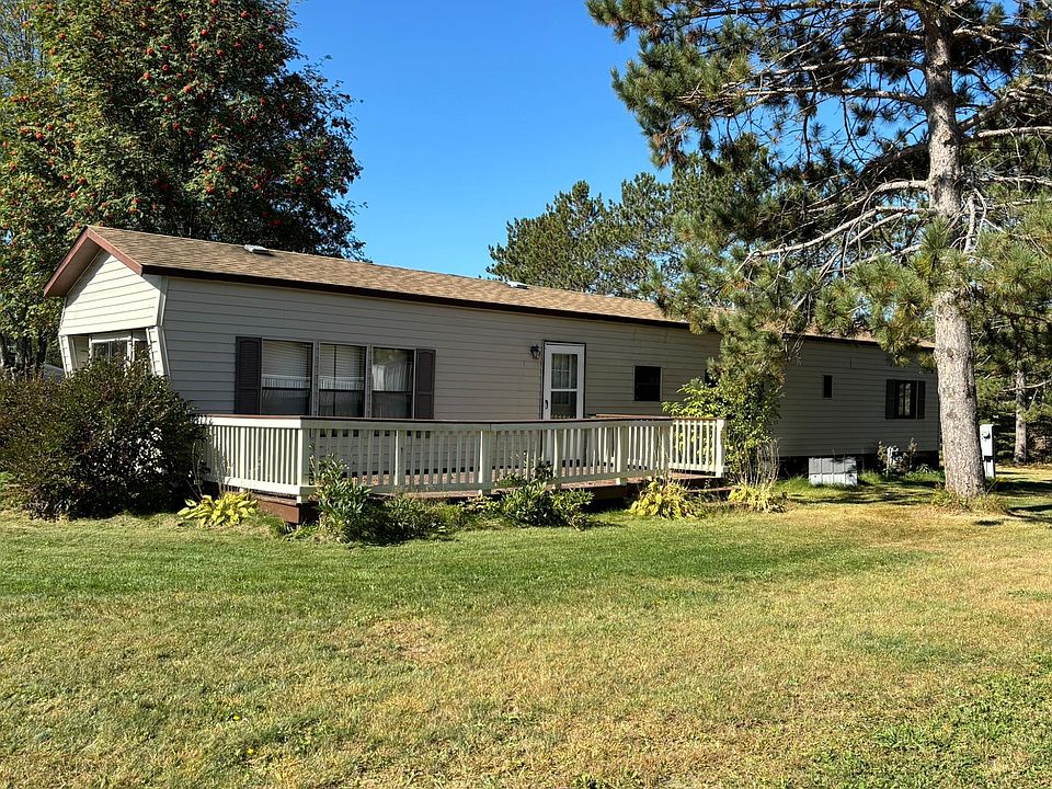 Two-bedroom, 14x70' manufactured home on large corner lot, paved driveway, landscaped for summer shade and curb appeal. The 18'x24, one-car detached garage has 8'9"x 6'10" automatic overhead door, cement floor, window, pedestrian door. Enclosed screen porch& kitchen with closet. Open living-dining area offers peninsula, natural light, egress to 23'8"x10'2" deck. Primary bedroom has access to bathroom with large tub, raised walk in shower & double vanity. Other amenities include gable to gable shingled roof, skirting, window air conditioner, natural-gas forced-air heat, 4 ceiling fans, built-in dresser, exterior water spigots, lights, & electrical outlets. Lot rent is $515/mo, $415 net if paid by the 3rd of the month, includes garbage & recycle pickup, municipal sewer & water. Only emotional support animals. Near mini storage facility, ATV trail, hike & bike trail, & public park with hoops, tennis courts, ball fields, picnic shelter, play area. No real estate. Personal property only.