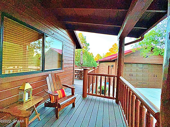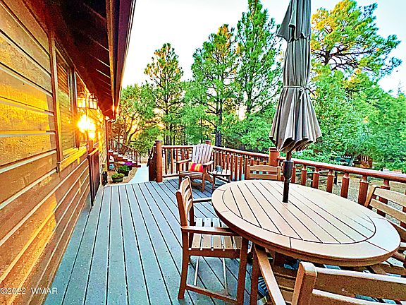 Here it is - your dream cabin in the tall pines, backing the National Forest. This completely renovated 2bdr/2ba cabin is not only charming but also shows like a model home. Upgrades include new flooring, paint/stain, tiled showers/bath, kitchen cabinets, granite, a large covered rear deck and the list goes on. The home also features a covered front deck that wraps around to a large outdoor dining space, grill area and 2-car garage. Inside, the great room opens to kitchen/dining area with additional built-in custom cabinetry for addl. storage. Through past guest bathroom with walk-in shower to the guest bedroom featuring a queen Murphy Bed for bdr/office flexibility and the large ensuite main bedroom that opens to that beautiful new rear deck with amazing sunset views of the forest beyond. beautiful rear deck.