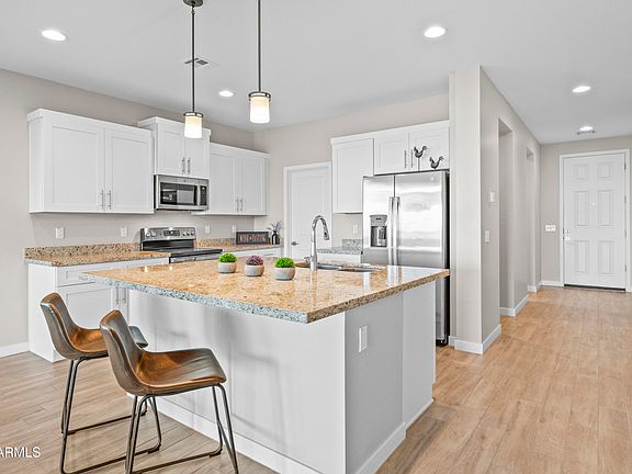 This AMAZING CUSTOM HOME offers SWEEPING MOUNTAIN VIEWS and a few steps to the GOLF course! Located in the GATED Wickenburg Country Club Estates, upgrades include granite countertops, shaker cabinets, top of the line stainless steel appliances, and an expansive pantry in the modern kitchen. Vaulted ceilings, ''SMART'' hub in the laundry room and access throughout, well insulated , custom window treatments and premium tile flooring enhance the open living spaces and save on utilities. The luxurious primary suite includes a custom tile shower, glass shower door, double sinks, and a huge walk-in closet! Epoxy flooring in the EXTRA LONG garage, a large covered patio, and all the benefits of the Wickenburg lifestyle—without expensive HOA fees!