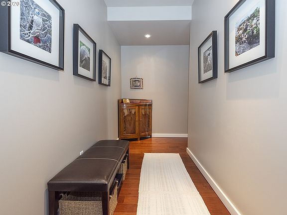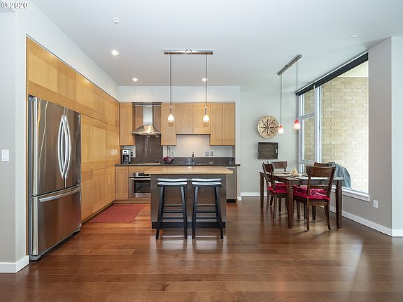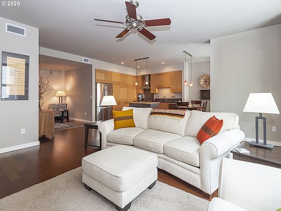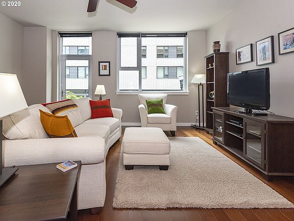 Contemporary condo in uber convenient location. Just a block to the street car. Located midway between downtown and South Waterfront. One of the best floor plans available for a one bedroom condo. Den is large enough to accommodate a Murphy bed or have an office or library. Kitchen has plentiful storage, a whole wall of cabinetry and an island with butcher block top and wine storage. Ceiling fans w/remotes in the LR and BR. Black out blinds in master bdrm. Impeccably maintained.