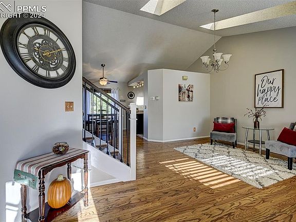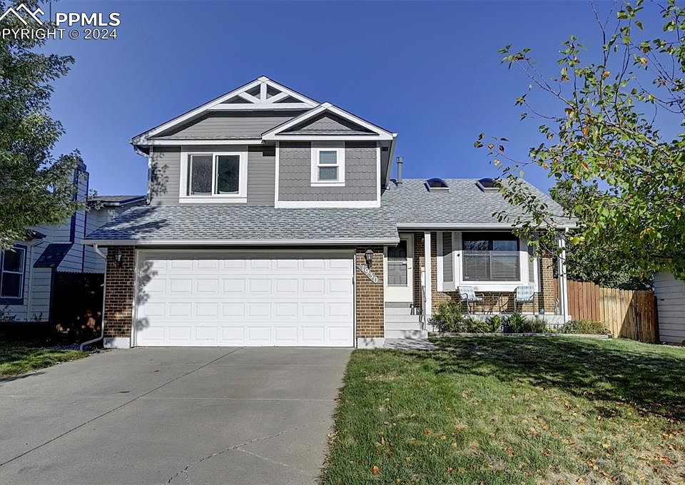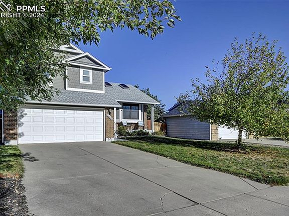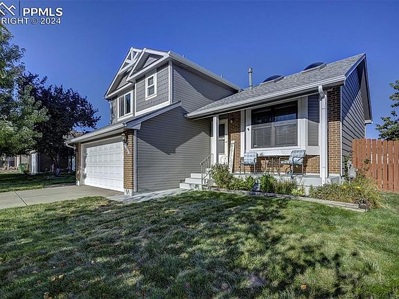 Welcome home to this well maintained tri-level in Rustic Hills! Beautiful hardwood floors on main level and stairs. Updated kitchen with granite countertops and stainless steel appliances. Cozy family room with electric fireplace. Newer patio door with built in blinds walk out to the gorgeous backyard with large concrete patio perfect for entertaining, small shed included to hold all your landscaping supplies. Roof and Skylights are 1 year old. Large master bedroom with attached bathroom, two other bedrooms are also on the upper level. Very nice front yard with apple tree, rose bush and a cute front porch. Ideal location close to the Powers corridor, shopping and restaurants, as well as Peterson Air Force Base and Schriever Space Force Base. Newer furnace and A/C installed in 2020.