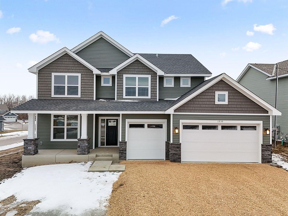 This home is complete and move-in ready! Welcome to Timber Creek, where the elegant Lewis floor plan combines spacious, modern living with a prime location. This 4-bedroom, 2.5-bath home is just minutes from Hwy 212 and I-494, with an elementary school within walking distance. The open-concept main level features a bright Great Room anchored by a cozy gas fireplace, a gourmet kitchen with quartz countertops, soft-close cabinetry, designer backsplash, stainless steel appliances, a walk-in pantry, and an oversized square island, as well as a main-level flex room with French doors, a spacious mudroom, and additional storage. Upstairs, four bedrooms await, including a luxurious owner’s suite with a spa-inspired bath, a versatile loft, and convenient laundry. The unfinished walkout basement offers endless possibilities for future expansion, while the fully sodded yard with irrigation and landscaping completes this move-in-ready home. Experience comfort, style, and functionality in the heart of Timber Creek.