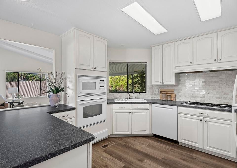 Beautifully updated 2BR/2BA + office/den, 1,344 sq. ft. home in Palomar Estates West 55+ community. Features include wood vinyl throughout, upgraded kitchen with newer appliances, large walk-in closet, fresh paint inside/out, new light fixtures, new front porch, refreshed landscaping, and new carpet on stairs & back porch. Open, light-filled floor plan, 2-car carport, and large storage shed. Resort-style amenities: pool, spa, fitness, pickleball, putting green & more. Prime San Marcos/Carlsbad location with low space rent!