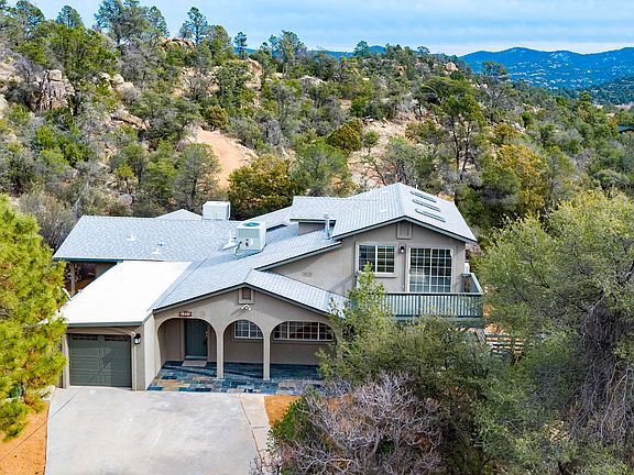 Gorgeous home with indoor and outdoor living. Retreat sits on a hill at the base of Thumb Butte with views of the mountain. Wonderful interior with total 4 bedrooms - two bedroom suites. Primary Bedroom en-suite is upstairs on it's own floor. Large closet, bathroom with new granite counters and double vanity, garden tub and shower. Private deck. Main level offers three bedrooms and two full baths. Junior en-suite has a private entrance. New granite kitchen counters and new stainless steel appliances. New window coverings throughout. New wood look tile flooring with new carpet in the bedrooms. NEW ENERGY EFFICIENT VINYL WINDOWS ON ORDER! Outside features natural landscape with boulder outcroppings. Find the stone path to the hidden pic-nic spot. More views