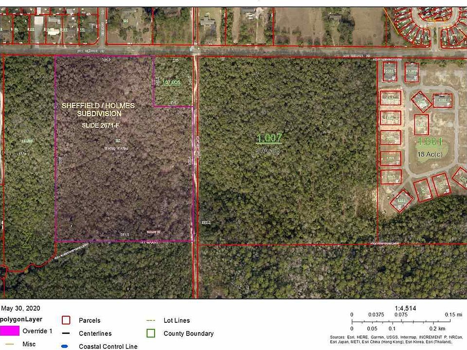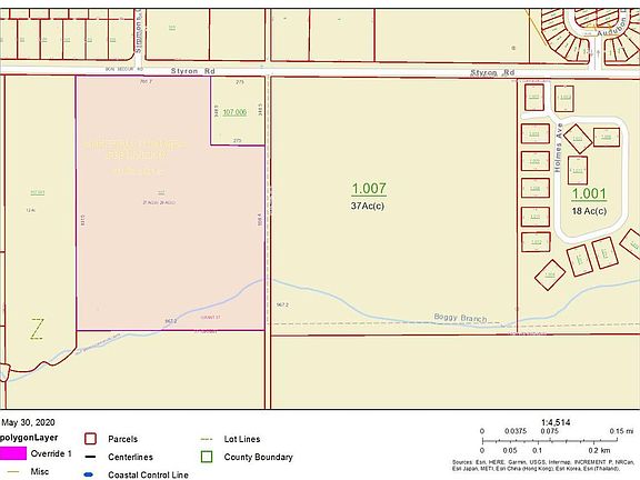 Approximately 26 acres on the south side of County Road 10 with 960 feet of paved road frontage, UNZONED, and in the county. Multiple uses are allowed, i.e., single family, multi-family, commercial, recreation. The southern border of the property is Boggy Branch, and this parcel is mostly uplands except for the Boggy Branch portion at the very rear. The lot is approximately 1260' deep. There are a few paths cleared on the property that can be accessed to view. The east boundary of the property is the power line easement that runs north/south. The property is 1/2 mile west of Highway 59, on the south side.