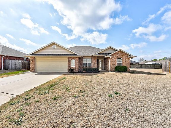 Discover the perfect canvas for your dream home in this delightful three-bedroom, two-bathroom residence tucked away at the end of a peaceful cul-de-sac. From the moment you enter the entryway that leads into the spacious kitchen, you will feel welcome. It features an abundance of storage with lots of cabinets and counter space, a large island for culinary creativity, and an expansive dining area ideal for hosting memorable gatherings. Flowing seamlessly from the kitchen, the generously sized living area invites you to relax and enjoy the company of family and friends, with plenty of natural light that streams through its windows. The primary suite is an oasis of comfort, offering ample space for rest and rejuvenation. Its ensuite bathroom is equipped with dual vanities and a jetted tub. Safety is a priority, and the inclusion of a 4-person above-ground storm shelter in the garage offers invaluable peace of mind. Outside, the large backyard awaits your creativity. It features a storage shed for garden tools and essentials, and this expansive outdoor space is ready to be transformed into your own private haven. While this charming home is move-in ready, it presents a unique opportunity for you to add value with some cosmetic updates, such as new paint and carpeting, allowing you to make it your own truly. Welcome home!