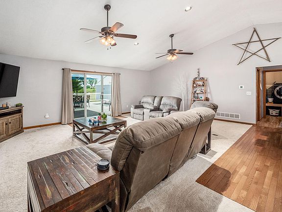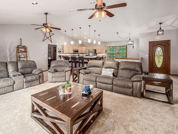 serene living in this stone and vinyl ranch home on 5.47 acres complete with 2 car garage and a 30x40 pole barn (200 amp srvce) stocked fishing pond! Close to town but in the country! 3 bedrooms 2 full bathrooms Open great room with dining bar and eating space. Stainless steel appliances. Private owners on-suite with jacuzzi tub. Walk in closet. Wood floors, carpet and a full basement you can finish to double your living space.