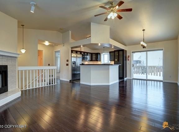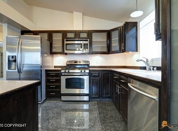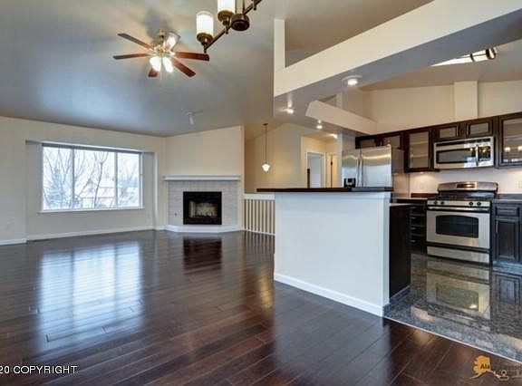 South Anchorage Stylish Gem, Open Concept, Clean & Bright w/new carpet thru out. Living Rm, Vaulted Ceiling, Fireplace, bamboo flooring. Top floor Kitchen w/ granite flooring, SS appliances, Classy cabinets w/glass insets, large island, dining room slider to top deck over looks fenced yard. Spacious master suite w/private bath, his/her closets. Functional layout, 2 beds up & down. Lg. Laundry&bath