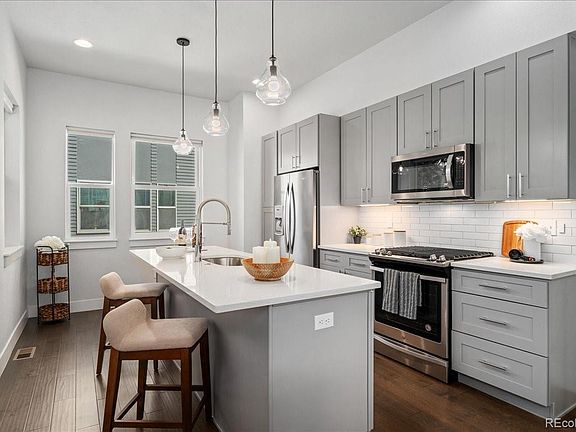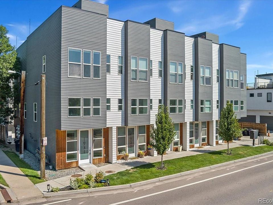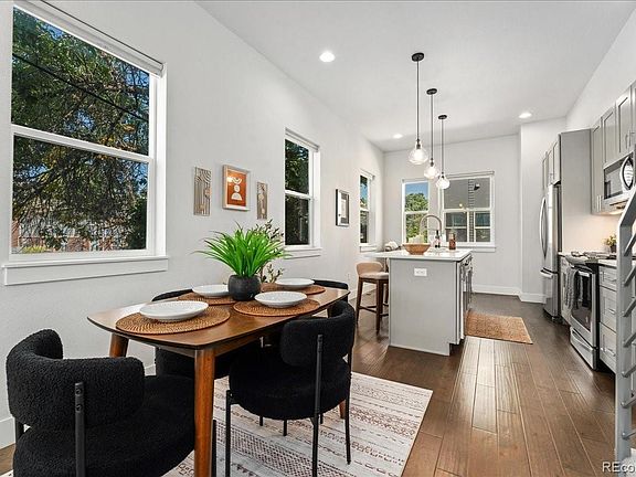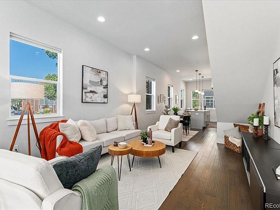 Built in 2017 by RedT Homes, this stunning corner unit townhome combines modern design with thoughtful upgrades throughout. Step inside to brand-new carpet and rich Capella engineered hardwood floors that add warmth and style. The open-concept main level is flooded with natural light from multiple windows and features a unique loft space just off the living room, perfect for a home office, reading nook, or creative studio. The chef’s kitchen boasts an upgraded Whirlpool appliance package, including a gas range, sleek quartz countertops, and ample cabinetry. Upstairs, the primary suite offers a breathtaking skyline view, while the second bedroom is conveniently located next to the laundry area for added ease. High ceilings create an airy, spacious feel, complemented by a third-floor storage closet for additional organization. Enjoy endless entertaining on the expansive rooftop deck, complete with sweeping mountain and city views. A tankless water heater provides modern efficiency, while the tandem garage offers plenty of parking and storage. With a party wall agreement and no HOA, this home offers both convenience and freedom in an unbeatable location.