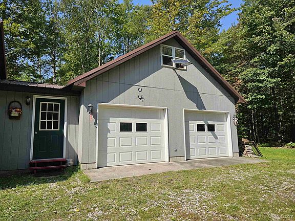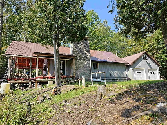 Escape to your dream hunting lodge with this stunning off-grid retreat, nestled on over 73 acres of pristine wilderness! Built in 1991, this beautiful camp showcases an open-concept living area, highlighted by a vaulted ceiling and a massive limestone wood-burning fireplace that serves as the heart of the home. The craftsmanship is impeccable, featuring maple hardwood floors, a knotty pine ceiling, cherry wainscoting, and hand-cut white cedar beams, all sourced and milled locally from the property. The main level offers a cozy bedroom and full bath, while an additional loft bedroom overlooks the living space. For added convenience, there’s an attached heated and insulated two-car garage with a loft above, perfect for converting into an extra bedroom or living area. Step outside to a large rear deck with breathtaking views of Merwin Creek, and follow the walkway to the generator shed, which fully powers the cabin. Solar panels are also negotiable to supplement power for an even more sustainable setup. Water is supplied by a drilled well with a natural artesian flow, while a septic system takes care of waste from the indoor plumbing. The property is easily accessible via County-maintained River Road, with a solid trail road and easement over a power line providing seamless entry. Multiple trails wind through the expansive acreage of Maple, Elm, & Poplar, ideal for hunting, hiking, or exploring, and it comes equipped with 3 deer blinds for prime hunting opportunities. Gas appliances and lights are included, with some furnishings negotiable. Don’t miss this rare opportunity to own a one-of-a-kind off-grid retreat on over 73 acres, where adventure and tranquility await!