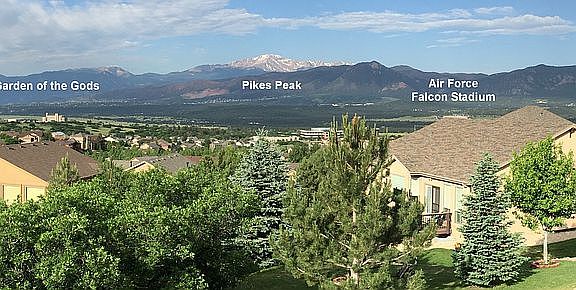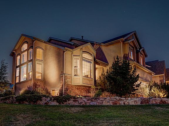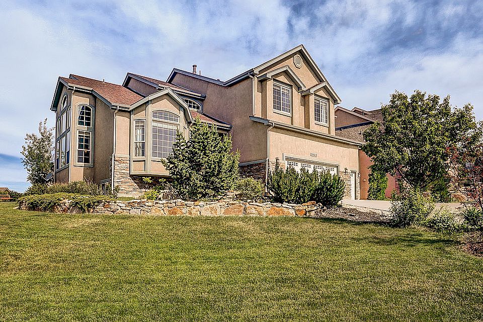 AMAZING VIEWS from this home at the top of Stone Crossing. Walls of windows throughout the home frame the Front Range from Cheyenne Mountain to the Air Force Academy. Enjoy Pikes Peak from the master bedroom, master bath, living and family rooms, breakfast nook and patio. Newly remodeled gourmet kitchen features Italian leathered granite wraparound counters, custom barn doors, and reclaimed wood accents. New hardwood oak flooring on the entire main floor adds to the beautiful grand entry with winding staircase. Main level features remodeled family room with 20 foot floor-to-ceiling stacked stone hearth fireplace and office/study with French doors and bay window. Upstairs you'll find 4 bedrooms with walk-in closets and 3 full baths. The master bedroom features a luxurious bathroom with 3 sided fireplace and oversized tub. Large 3-car garage with ample storage. Fully finished basement features a granite wet bar and fireplace, pool table, 5th bedroom, and a oversized jetted tub in the bath. Perfect area for entertaining or serving as a mother-in-law suite. New carpet and new roof in 2020.