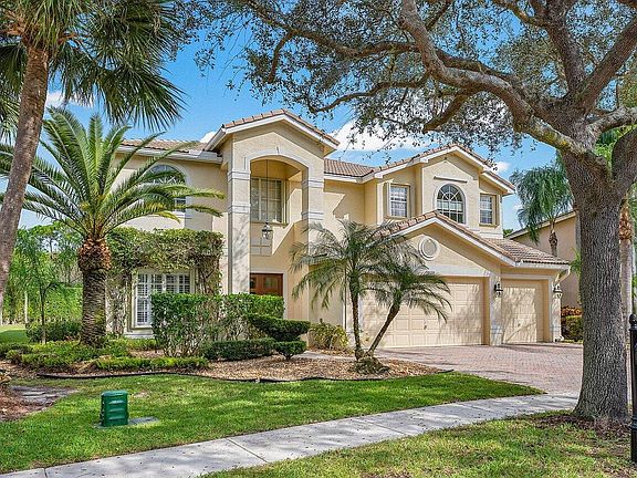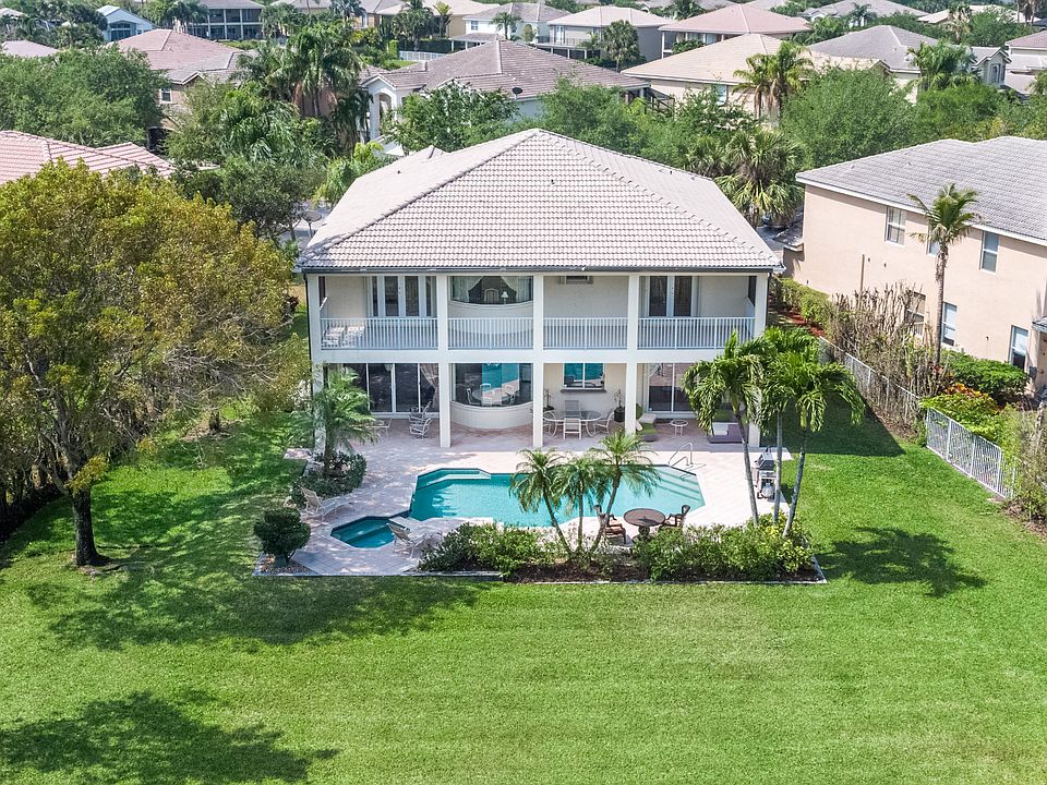 This palatial 5 BR/4BTH pool home with a 3 car garage is on one of the largest(1/3+ acre) and best pie shaped lots in Saturnia. Residence has an open living concept, pristine marble floors and a large gourmet kitchen with stainless steel appliances, granite countertops and backsplash, under counter lighting, custom hardware and a whole house water purifying system. The sweeping staircase of wood ascends to a landing where the Primary and 3 BR are located. The Primary has a spacious bath & separate marble shower. First floor features a guest BR. An open pool with raised spa and waterfall, 10 x 50 covered porch with brick pavers and expansive yard highlight the potential for outdoor entertaining. Close to Boca's best parks and A rated schools.