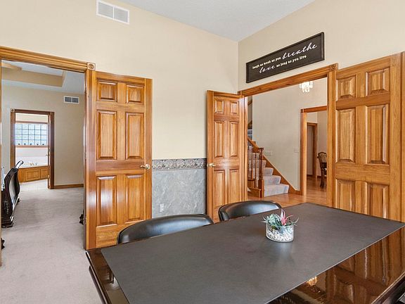 Individual Floor plans are attached in the documents. Custom built by Steve Fredrick; this home is conveniently located in Aboite Township overlooking 2 of the ponds in Bridgewater with dramatic views from every room. Upon entering the home, the 2-story foyer and Living Room ceilings feature crown molding as well as the Dining Room, you are right next to the home office with built in cabinets. This office has a private access to the Main Level En-Suite which has trey ceilings. The formal dining room and living room will greet your guests. There is newer carpet in the Family Room and LR. The kitchen with island and granite counter tops is open to the diamond shaped nook and the family room. The cabinets are custom, solid wood. The Fireplace in the FR is flanked with built in bookcases. The patio door off of the nook gives you access to the deck and grilling. The back yard offers plenty of room for yard games. The Finished lower level offers a rec room with wet bar and another full bath for guests. There is a radon mitigation system in place. Plus, there are 2 extra rooms in the lower level that would be great hobby, storage or short-term guest bedrooms. This beautiful home offers a new 50-year roof put on in 2019 along with a new Hot Water Heater and sump pump w/battery backup. All appliances stay including the washer/dryer. The home was recently painted inside and out. Most rooms have ceiling fans already in place.