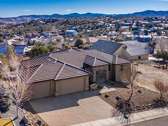 YOUR SEARCH IS OVER if you have been waiting for a conveniently located, NO HOA, NEWER [2013] single level 4 Bdrm split plan w/3 Car Garage & WONDERFUL VIEWS fr SanFran Peaks w/Dells, Bradshaws, Golf Course, Glassford & Mingus in-between ... even Thumb Butte in front. Welcoming exterior is stucco w/stone accent, concrete tile roof, paver drive & walkway + 420sf composite deck on the VIEW side ... Steps fr Deck lead to under-house storage w/concrete pad [ideal for workshop, storage OR?]. Great Room plan w/4th Bdrm [or Office] off Foyer, stone corner natural gas fireplace, ceiling fans, inviting colors, engineered wood floors in key living spaces including Master, tile in Foyer, Kitchen, Laundry [w/sink] & 2 Baths, carpet in 3 Bdrms. Kitchen features custom Alder cabinets, gorgeous Granite