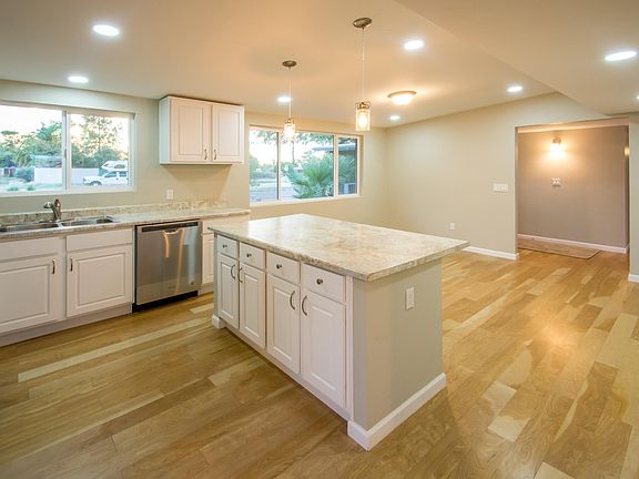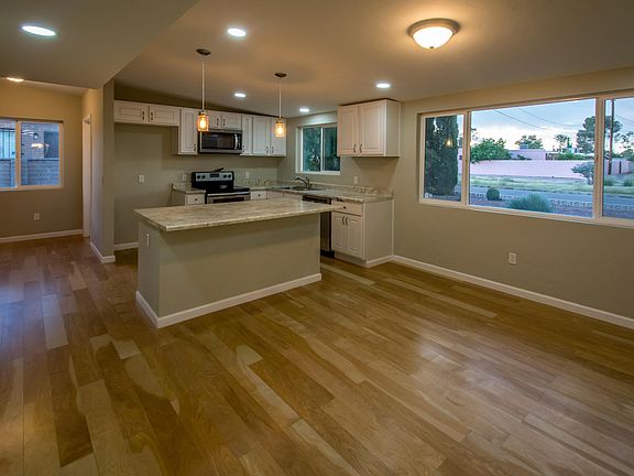 This is a beautifully remodeled home in a great east side neighborhood. 3 bedrooms/ 2 baths. All new A/C, furnace, carpet, windows, doors, electric panel, lighting, vanity, title, toilets, Birch wood floors, paint, textured all the walls, ceiling fans, electrical outlets, cool coated the roof. Brand new kitchen with new cabinets, countertops, microwave, electric stove, and dishwasher. Come take a look and see all that it has to offer.