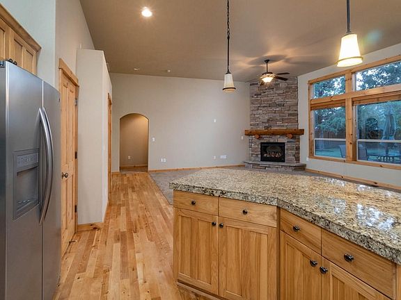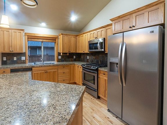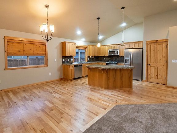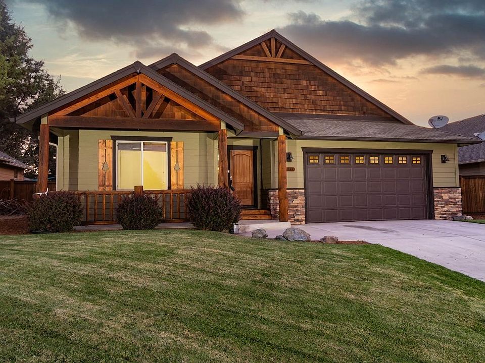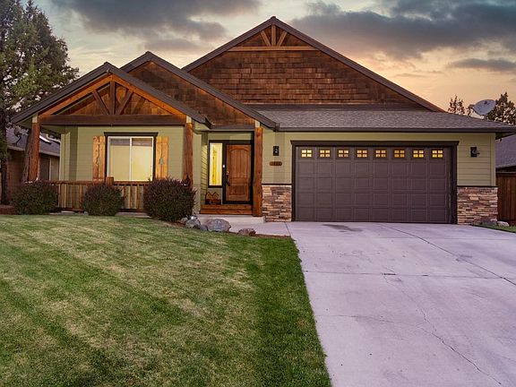 Craftsman home with Country Lodge feel on large lot in Redmond. Open concept in living room, kitchen and dining room with access to very nice fenced backyard with pergola covered patio. This 1650 sq.ft. home built in 2007 features 3 bedrooms, 2 baths, vaulted ceilings, gas fireplace with floor to ceiling stone surround, hickory floors, plant shelves and wood framed windows. Spacious kitchen features island with eating bar, pantry, ample counter space, gas range with electric oven, new dishwasher and granite counters with tile backsplash. Double attached garage, underground sprinklers front and back with drip system. Small area for extra parking on north side of home. No HOA's. Great for outdoor entertaining!