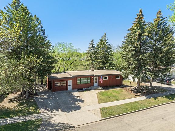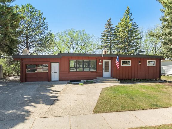 Welcome home to this Mid-Century Modern gem located on established Skyline Drive in Northwest Minot. 1933 Skyline Drive checks all of your boxes with its picturesque coulee views, large yard, mature landscaping, striking red exterior, attached garage, and easily walkable neighborhood. Inside of this charming home, you will love the hard flooring throughout, fresh paint, and the large main floor living area, which easily flows into the formal dining room with built in hutch. The kitchen, with fantastic views, large pantry, and updated appliances is the perfect spot for meal prep or a midnight snack. Down the hall, you will find the updated full bathroom and three spacious bedrooms. While the main floor is spectacular, the lower level will be your oasis with its spacious laundry room, updated bathroom, four bedroom, and the most fantastic living area with loads of built in shelving, backyard access, recessed lighting, and wood burning fireplace. Do not delay, call for a showing today!