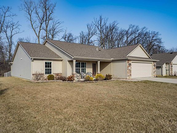 Welcome home to this spacious split bedroom custom built ranch boasting a covered back patio & big fenced yard—in NW Allen County School District! Located in highly desirable Stratford Forest subdivision just north of Bass Rd, on quiet & peaceful cul-de-sac, this 3 bedroom, 2 full bath home is sitting pretty with charming curb appeal & beautiful wooded backdrop providing additional privacy. Built in 2015, the classic exterior is eye pleasing mix of vinyl & stone facade with detailed landscaping & inviting covered front porch perfect for quick visits with friends & neighbors. Step inside impressive front entry with twin sidelights allowing plenty of natural light into bright & welcoming atmosphere complemented by quality wood vinyl plank flooring (in foyer, kitchen & nook) & soft neutral color palette—move-in ready & waiting for you to add your own personal touch! Large foyer has closet & built-in shelving in corner linking open concept main living area which feels even bigger with high ceilings. Cozy great room has stone fireplace, carpet & 8’ sliding glass doors to back patio. Extra long central island with seating separates living from fantastic kitchen with everything you need to cook delicious dinners or entertain! Kitchen has abundant cabinetry, SS appliances, walk-in corner pantry, composite farm style kitchen sink & wonderful dining nook where you can enjoy meals with view to back yard. Generous primary bedroom has recessed ceiling & en suite bath with tub/shower & huge walk-in closet. Remaining 2 bedrooms are both comfortably sized with ample storage throughout; all bedrooms + living room have ceiling fans to keep air flowing. Main bath also has tub/shower combo; sizable laundry with cabinets in hallway to garage. Oversized 3 car garage includes storage shelves & floored attic. Head out back to the covered 10 x 17 patio where you can kick back & relax, dine al fresco or fire up the grill no matter the weather. Fenced back yard has all kinds of room for outdoor fun & activities & backs up to wooded area offering serene nature views. Walkable community has ponds, woods & small trail ideal for strolling or walking your furry friend. It’s also just down the road from Buckner Park. Mere minutes from Illinois Rd & I-69 with easy access to shopping, dining & groceries as well as many nearby amenities from local eateries to Jefferson Pointe. Ready for your best summer yet? Reach out today!