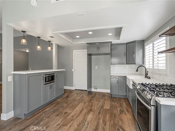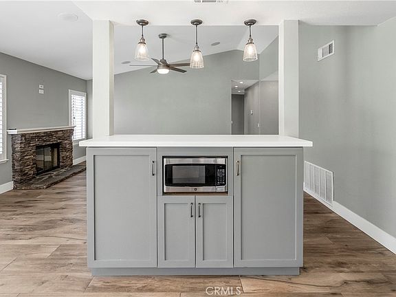 Orangecrest – a 3 bedroom, 2 bath, single-story opportunity in Orangecrest. A thoughtful kitchen and breakfast nook renovation introduces an open floor plan that unites the common areas. The complete kitchen remodel included quartz counter tops, stainless steel appliances, and an extension of the cabinetry along the east wall, maximizing storage and countertop space. A center buffet island transitions into the adjacent family room with vaulted ceilings, fireplace with stacked stone hearth, recessed lightings, and prewiring for in ceiling speakers. The central hall leads to an upgraded hall bath and two secondary bedrooms with plantation shutters. Vaulted ceilings and a sliding glass door access to the rear yard create a light and airy primary bedroom. Wainscoting, reclaimed wood paneling, and barn doors add a refined yet warm feel to the room. The primary bathroom has been remodeled as well with an upgraded vanity and tiled in shower enclosure and glass surround. Outside, the rear yard is finished with two patios, mow curbs, and a central patio and shade structure for outdoor gatherings. The exterior was just painted adding continuity to the aesthetic between the interior and exterior. Seldom on the market in this area, come see this remodeled single story!