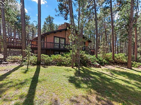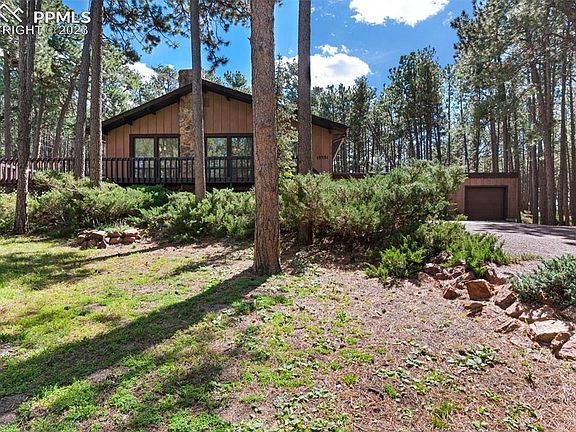 Welcome to the sound of wind in the pines. This 3/4 acre lot is the heart of Woodmoor and definitely in the trees. There is a wraparound deck to enjoy the setting. You'll have 4 bedrooms, 2 baths, a 3 car garage, and a workshop with a convenient overhead door to the back yard. There is a spacious living room on the main floor with a wood burning fireplace. There is a large family room with a wood burning fireplace and a smaller 2nd family room or bonus room. The large laundry room on the lower level has a walkout to the yard. Yes, there are 2 wood burning fireplaces and some stacked firewood outside to be included. Yes, this house is in need of cosmetic updating but it's a great place to start.