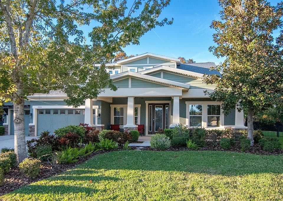 Welcome to Lakeshore Ranch, a premier guard-gated community in the heart of Land O’ Lakes. This exceptional 4,108 sq. ft. home offers 5 bedrooms, a media room, bonus/flex space, 4 full baths, and a three-car garage. Set on a premium conservation lot in a quiet cul-de-sac, this WestBay Longboat II floor plan offers spacious living designed for comfort and entertaining. A charming front porch leads to a bright foyer opening to the grand room, gourmet kitchen, and dining area—all flowing to the expansive lanai. The grand room features 12-ft ceilings and a stone accent wall with tray ceiling. The gourmet kitchen includes 42-inch espresso cabinetry, stone countertops, pendant lighting, a large island, gas cooktop with hood, double ovens, stainless appliances, and a coffee bar. Hardwood floors span the main living areas, with tile in wet spaces and new carpet in bedrooms. Twelve-foot sliders open fully to the oversized lanai with pavers, fire pit, stone seating, surround sound, and peaceful conservation views. The fenced yard offers privacy and natural scenery. The first-floor owner’s suite includes a custom walk-in closet, dual vanities, garden tub, and frameless walk-in shower. Secondary bedrooms are well-spaced, with one upstairs beside a full bath—ideal for guests. The second-floor media room features a wet bar, cabinetry with lighting, mini fridge, and ice maker. The laundry room includes a utility sink, cabinets, and gas/electric hookups. Upgrades include a whole-home generator, 1" water supply with softener and filtration, upgraded HVAC with return air in bedrooms, CAT6 and coax pre-wire, CCTV wiring, 2025 roof, new carpet, built-in surround sound, and more. Lakeshore Ranch offers resort-style amenities: 24-hour gatehouse, three pools, clubhouse, fitness center, yoga room, business center, tennis/pickleball, basketball, dog park, playground, fishing dock, and 250+ acres of conservation. HOA includes cable, internet, and trash. Minutes from top-rated schools, I-75, Veterans Expressway, shopping, dining, Tampa Airport, and beaches.