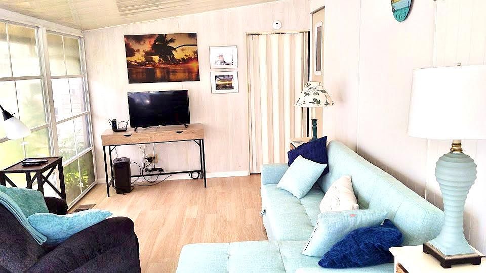 MINIMUM HOMEOWNER AGE: 55 MINIMUM RENTER AGE: 35 + Park Application Fee for guests: one-time fee of $50 MUST be completed to use park amenities and stay in park. NO PETS, unless ESA documented and approved by park management. Cosy 1BR (1 & 1/2 baths) mobile home, located in 55+ RV park 1mi from closest beach. Great loc for cpls for a beach vacation, with simple, affordable accommodations. Pls contact us for negotiated longterm rates Up to 4ppl fit: (Bedroom: 2ppl & TV room/Sofabed/2ppl) BEACHES: - Bunche: 1mi - Fort Myers: 4mi - Sanibel: 6mi SHOPPING: Sanibel Outlets: 1mi GOLF: Kelly Greens Golf: 1/2mi Fully furnished, all-inclusive price. Tenants MUST be approved by park before move-in.